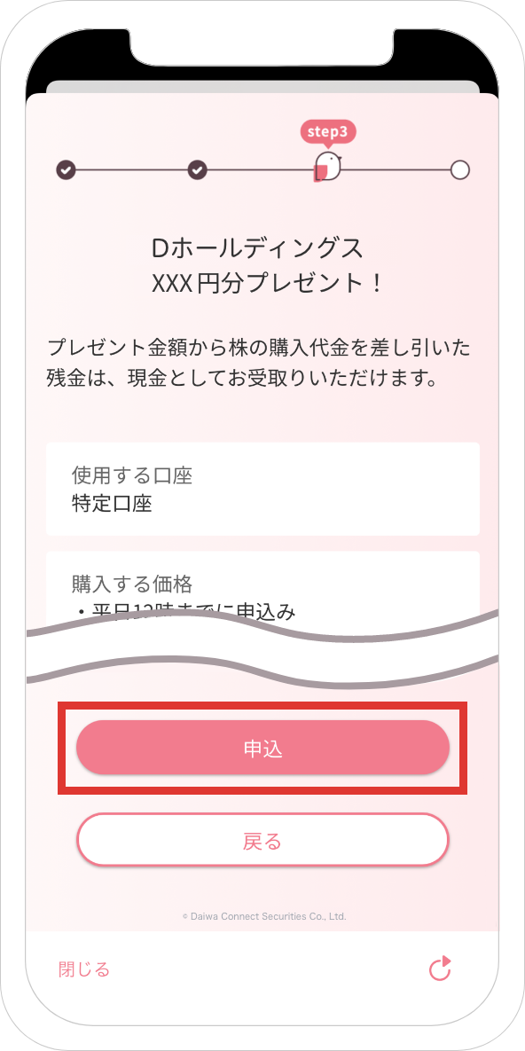 申込日当日の終値が購入価格となります。プレゼント金額の500円で購入可能な最大数量のひな株の買付注文が行われます。
