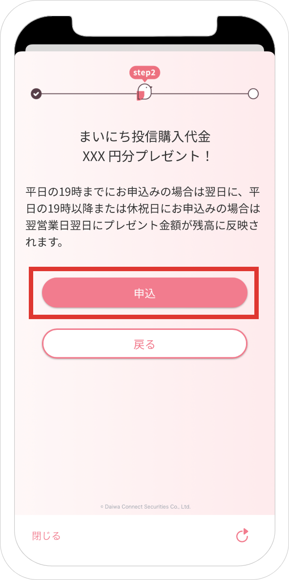 ●平日の19時以降または休祝日に「まいにち投信」の設定およびコースのお申込みが完了の場合