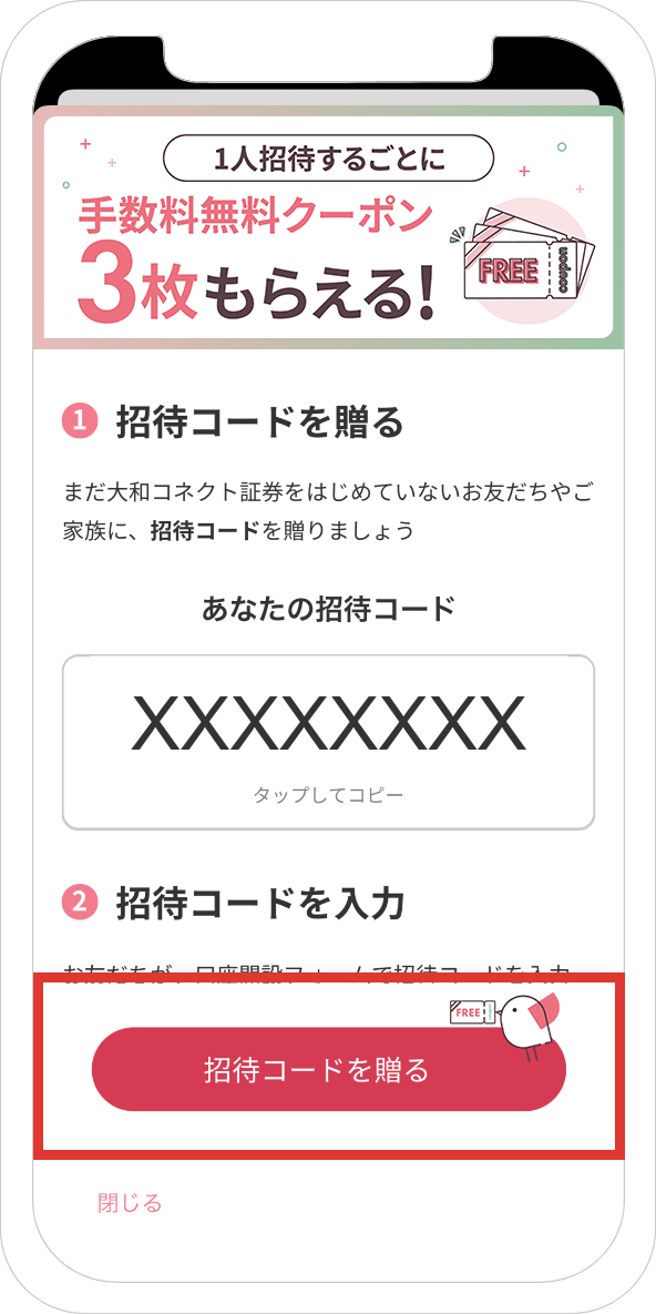 まず、招待者が大和コネクト証券未体験のお友だちに、招待コードを送ります。