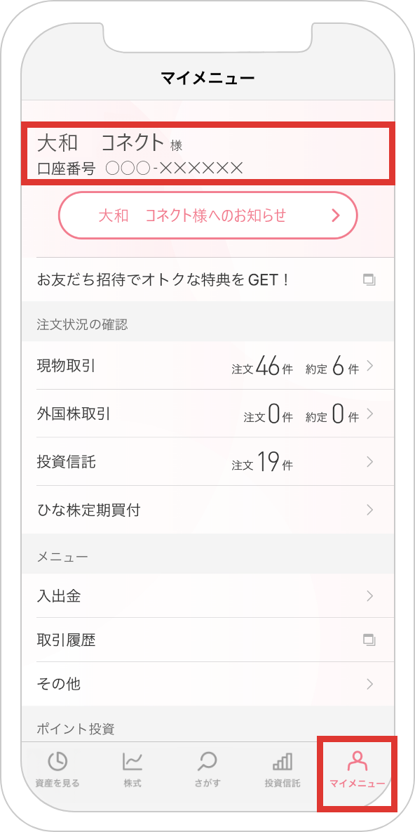 参加条件 | 大和コネクト証券の口座番号が「317」から始まるお客さま(みんなの銀行経由で口座開設されたお客さま) または 2025年9月1日(月)~2025年10月7日(火)までに、1回以上クイック入金(みんなの銀行)をご利用されたお客さま ※ただし、同期間における出金額の総額がクイック入金での入金総額を上回る場合対象外となります ※対象の方には取引アプリ内や登録のメールアドレス(案内メールを受信OKにしている方)へ招待状をお送りします |