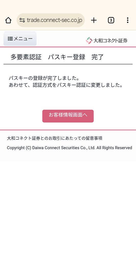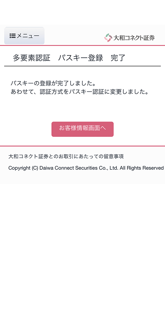2026年5月上旬のパスキー認証の必須化までは「マイメニュー」>「お客様情報の確認と変更」>「多要素認証」より変更が可能です。