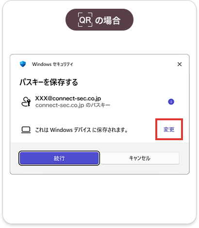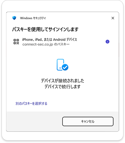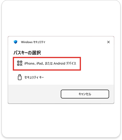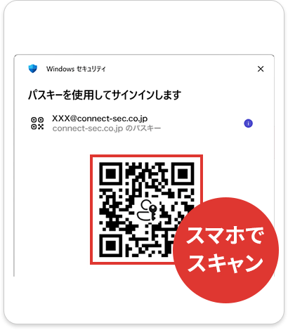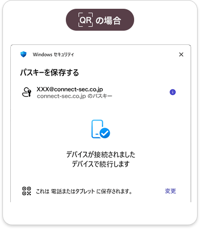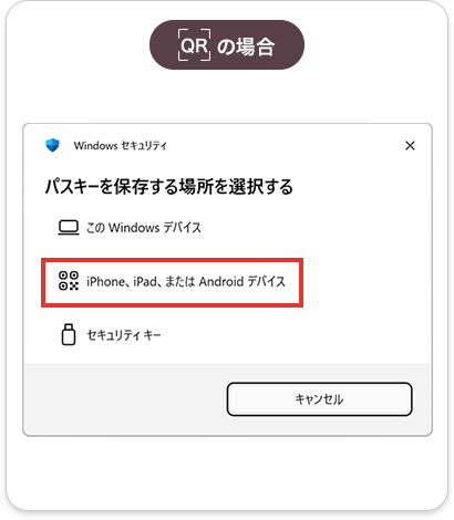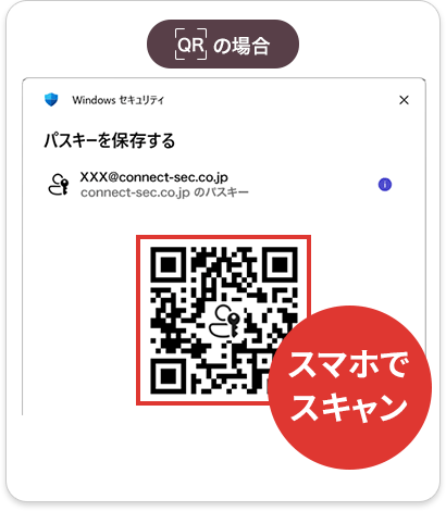 PCでパスキーを設定した場合、共通のID(AppleID、Googleアカウント)で管理されているスマホ端末をつかってQRコードを読み込むことにより、ログインが可能です。