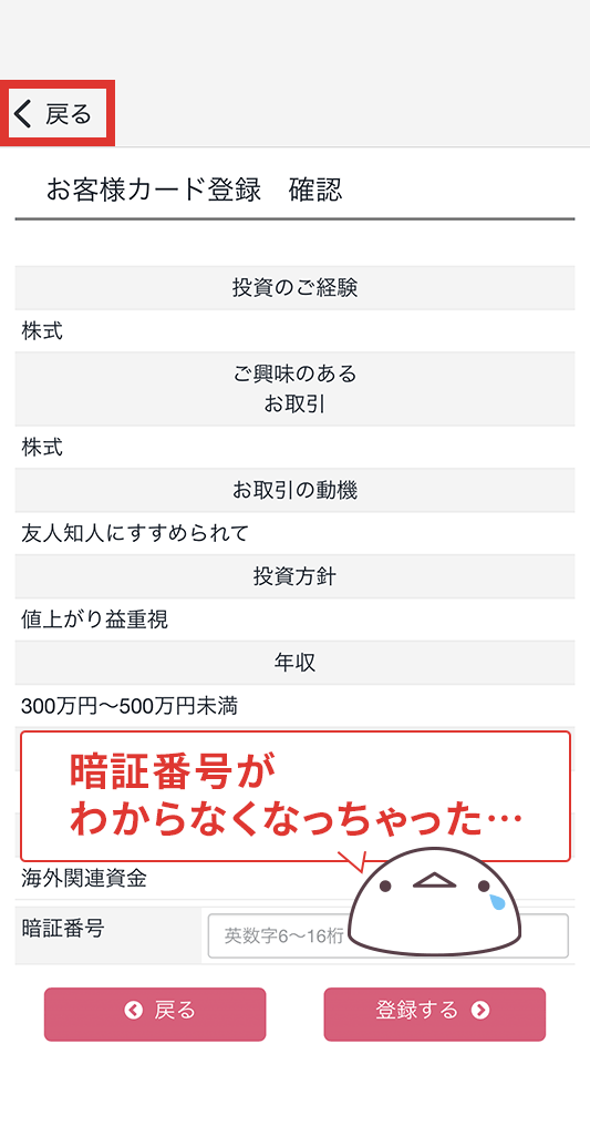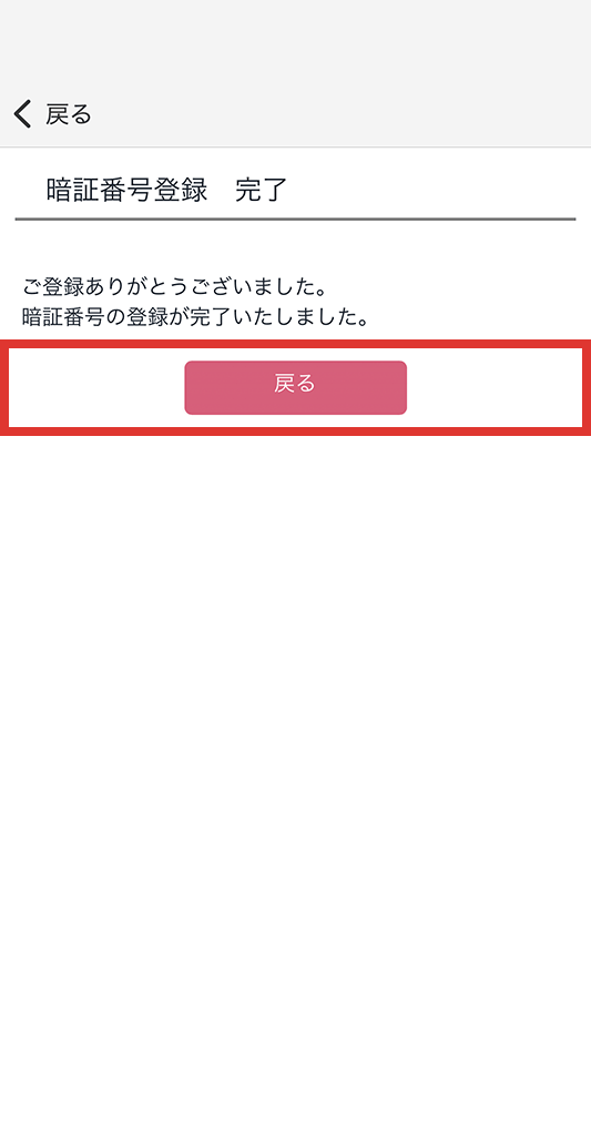 暗証番号の登録が完了したので「戻る」