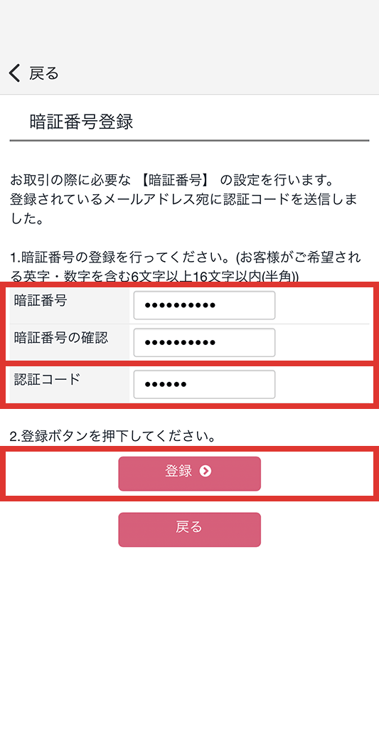 暗証番号(当社の)を入力して「登録する」をタップ
