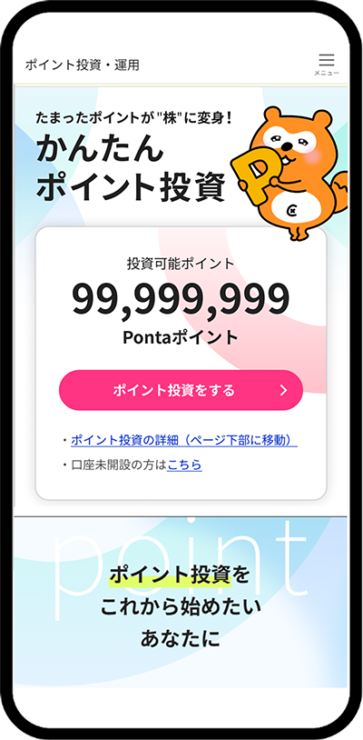 | 取引チャネル | Pontaアプリ内の「ポイント運用・投資」より |