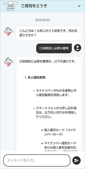 AIによる自動応答で適切な回答が見つからない場合は、オペレーターへ接続いたします(対応時間:平日 8:30〜16:30)。